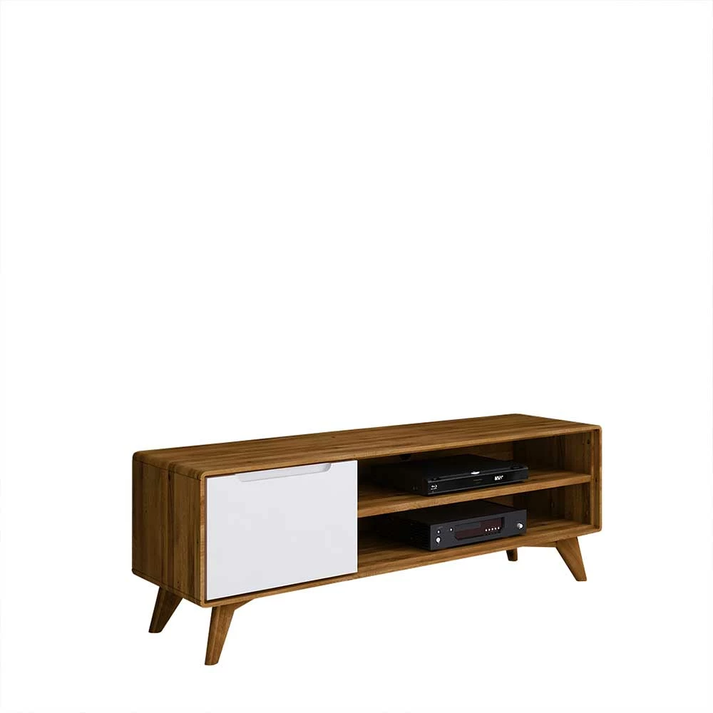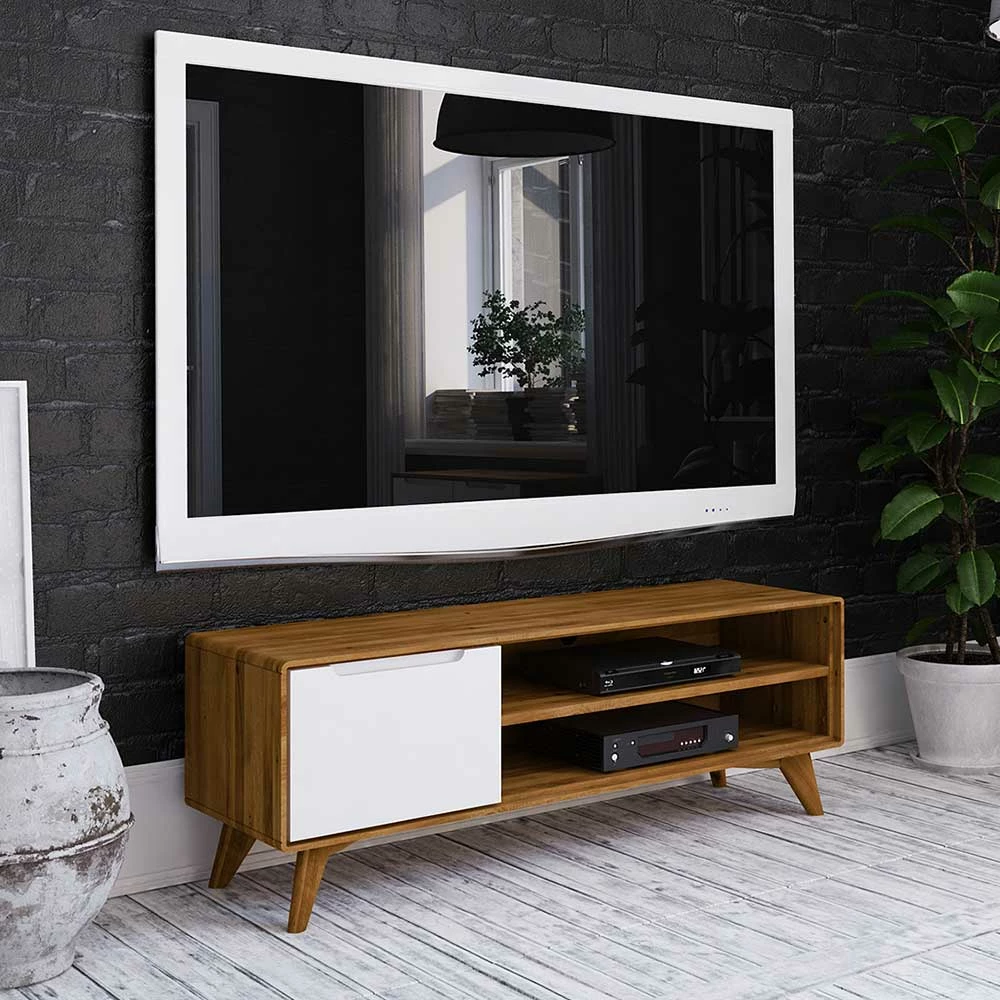 - Kontraststarkes TV-Board in Weiß und Wildeichefarben