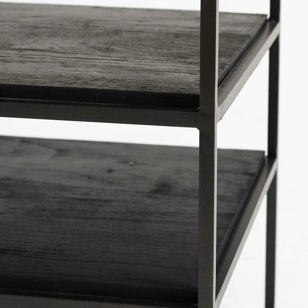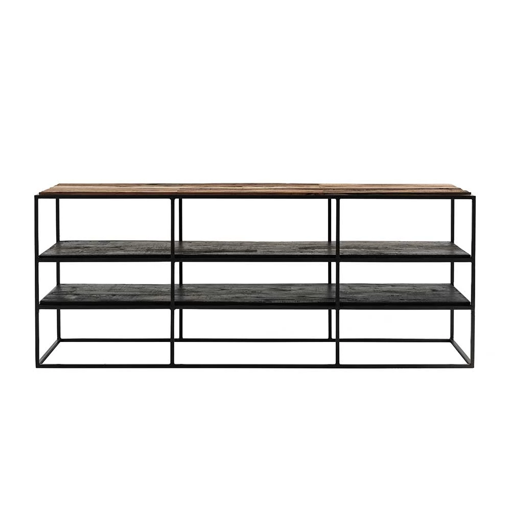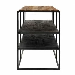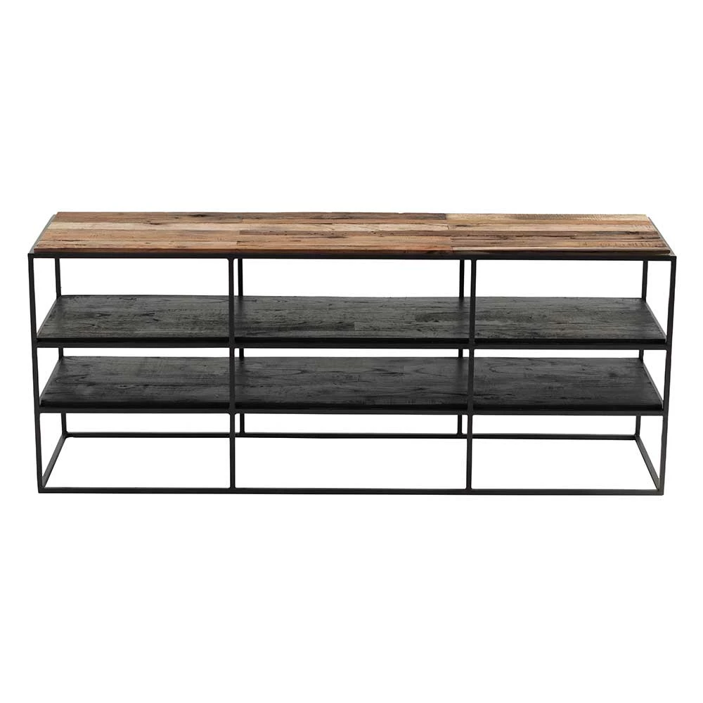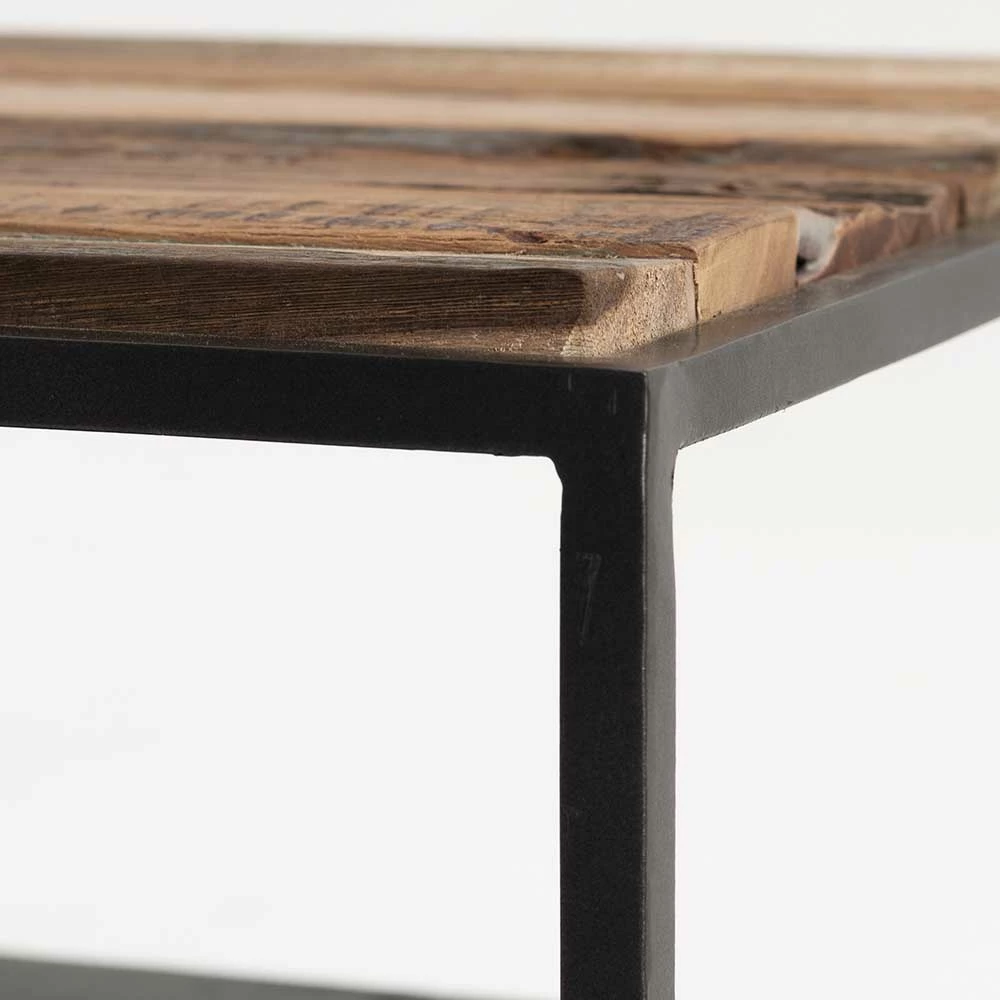 - Hergestellt aus massivem Recyclingholz (Oberboden), Mindi Massivholz (schwarze Böden) und Eisen