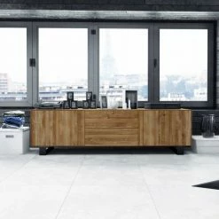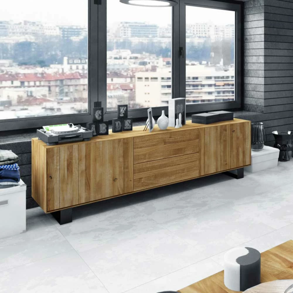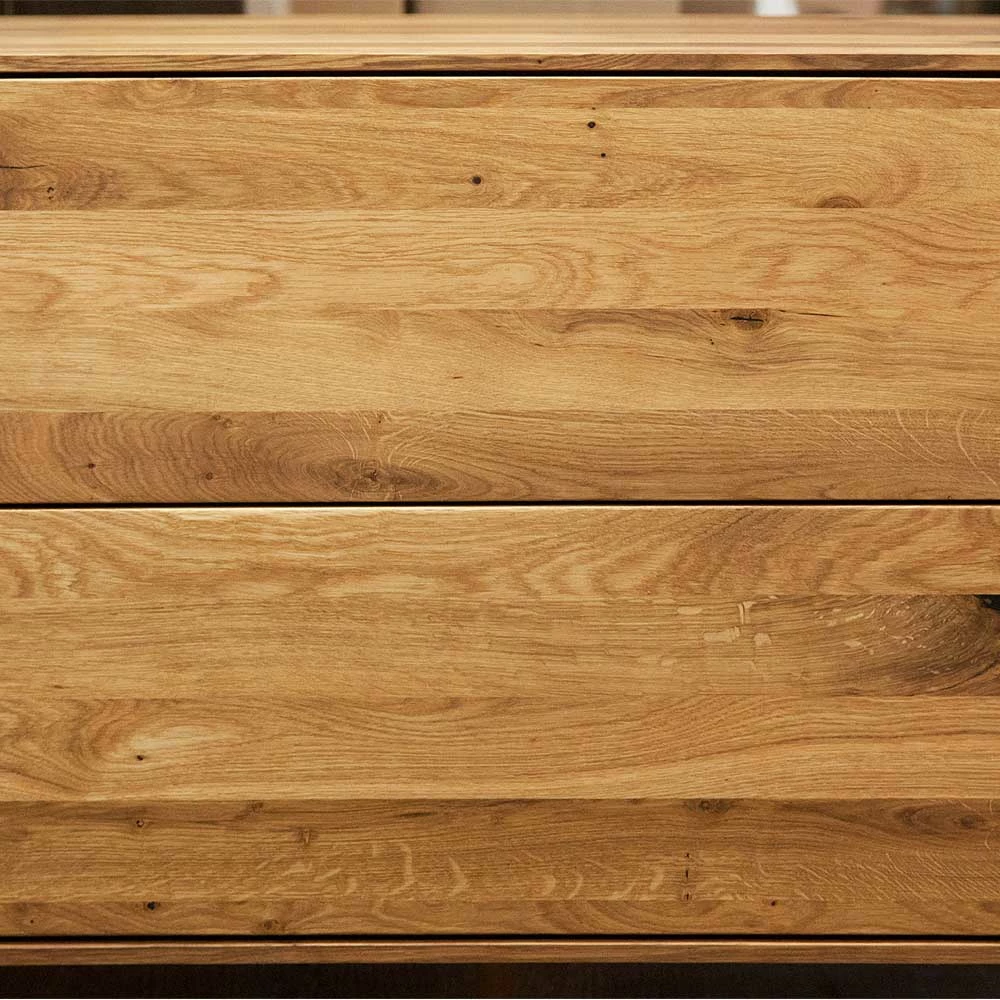 - Aus Wildeiche Massivholz (durchgehende Lamellen) und Stahl gefertigt, Rückwand aus Spanplatte