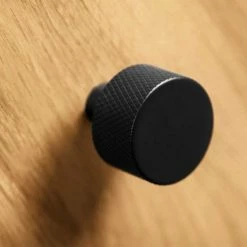- Schwarze, zylinderförmige Metallgriffe mit eingraviertem Rautenmuster