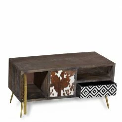 - Aus Mangobaum-Recyclingholz, Metall und Kuhfell gearbeitetet