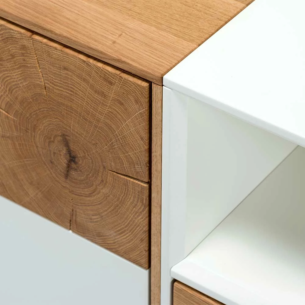 - Holzoberfläche geschliffen und geölt, MDF in matt Weiß lackiert, dekorative Hirnholzabsetzungen mit unikater Struktur