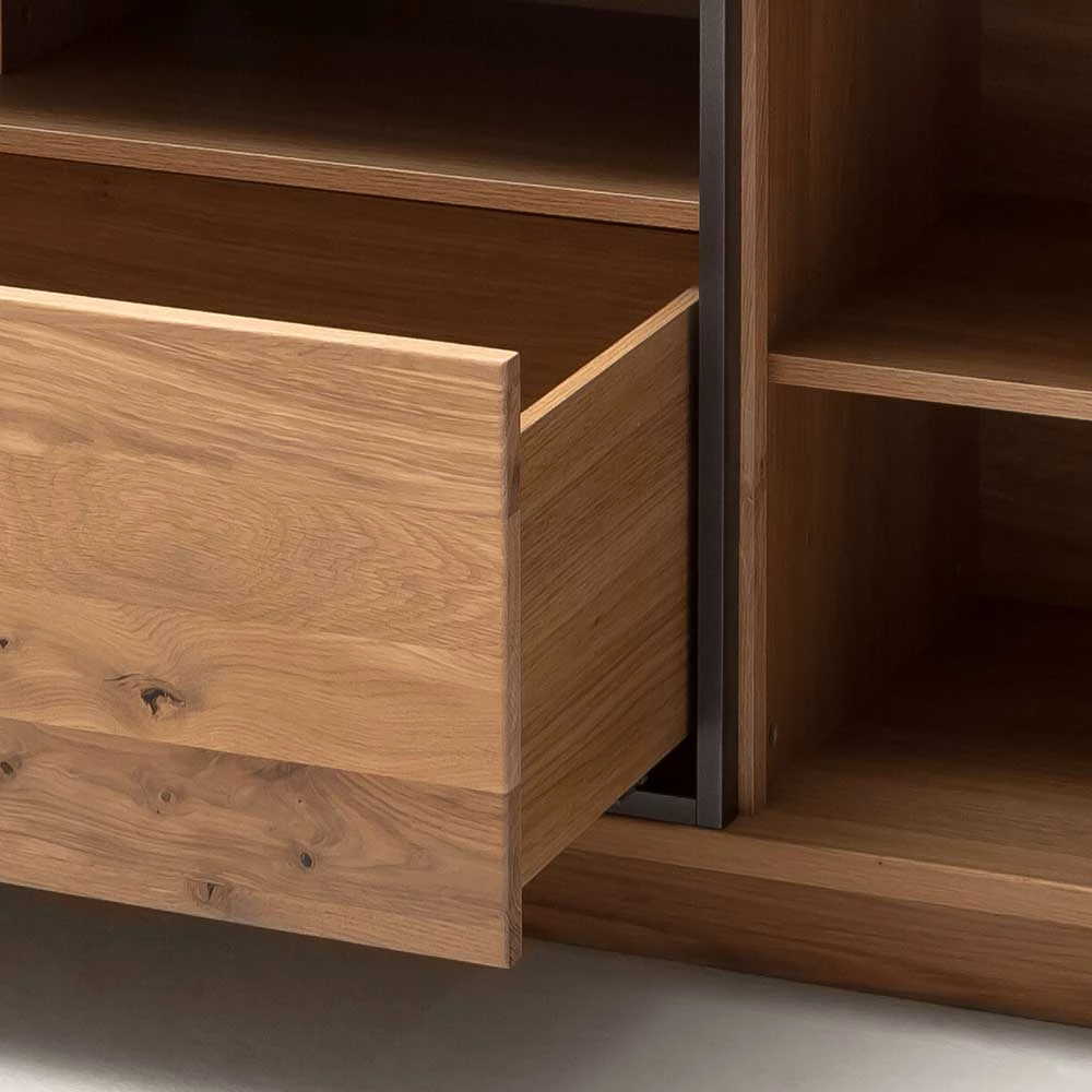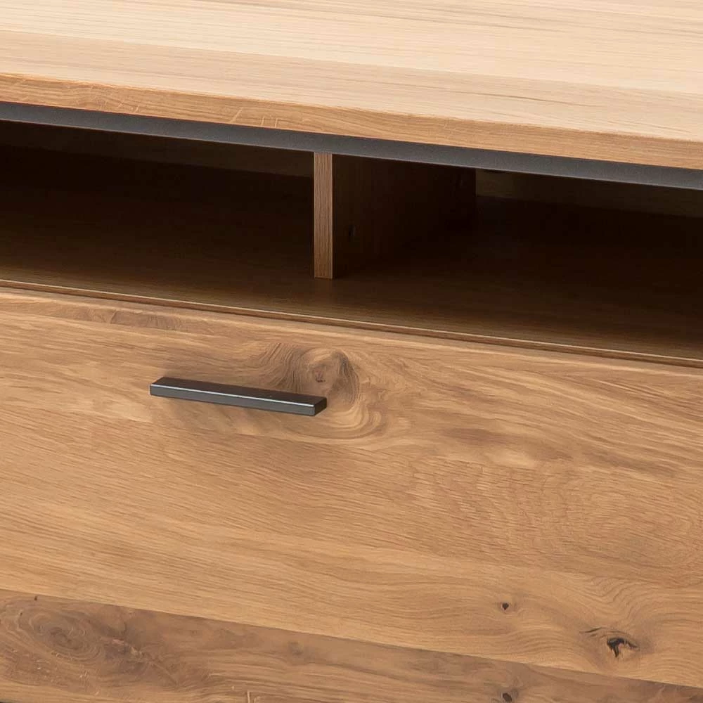 - Front Asteiche hell geölt, durchgehende Lamelle, Korpus außen mit Eiche Echtholz furniert und hell geölt, innen foliert in Holzoptik Eiche Bianco, Metall anthrazit pulverbeschichtet