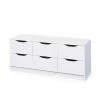 - Oberflächen Korpus, Türen und mittlerer Einlegeboden lackiert, Schubladenseiten und Einlegeböden hinter den Türen in Holzoptik Eiche, Trennwände in Weiß melaminbeschichtet, Massivholz geölt