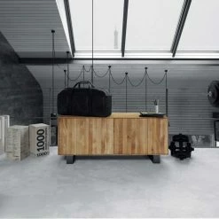 - Gefertigt aus Wildeiche Massivholz (durchgehende Lamellen) und Stahl, Rückwand aus Spanplatte