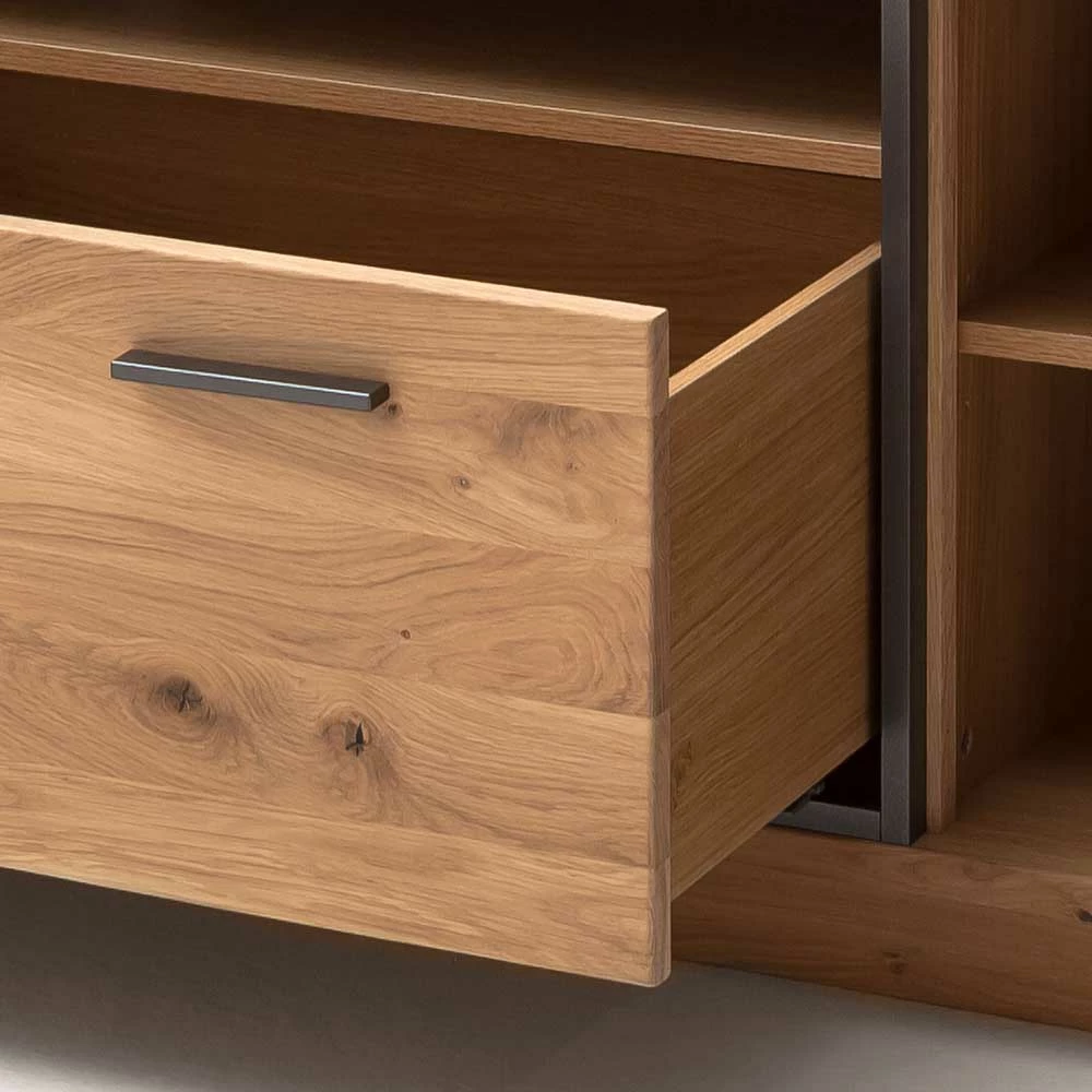 - Front Asteiche hell geölt, durchgehende Lamelle, Korpus außen mit Eiche Echtholz furniert und hell geölt, innen foliert in Holzoptik Eiche Bianco, Metall anthrazit pulverbeschichtet